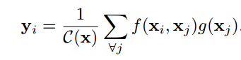 i는 output position의 index입니다. 공간, 시간 또는 spacetime이 될 수 있습니다. j는 모든 position을 열거하는 index 입니다. x는 입력 signal(image, sequence, video 등등)입니다. y는 x와 동일한 크기의 output signal 입니다. f는 xi와 xj 사이의 affinity 같은 관계를 나타내는 scalar를 계산하는 함수입니다. g는 위치 j에서 input signal의 representation을 계산합니다. C(x)에 의해 normalize 됩니다.