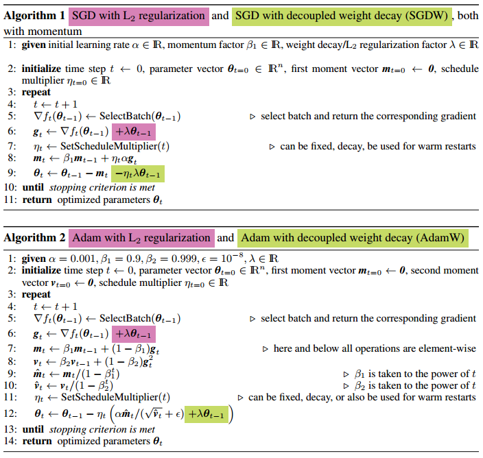 gradient based update에서 weight decay를 분리합니다. 왜 분리할까요? Adam에서 weight decay와 L2 regularization이 동일하지 않기 때문입니다.