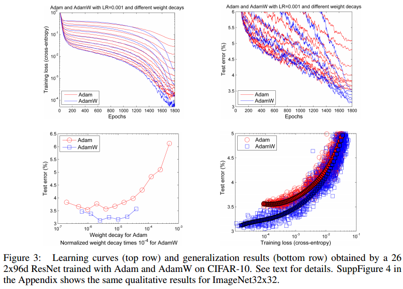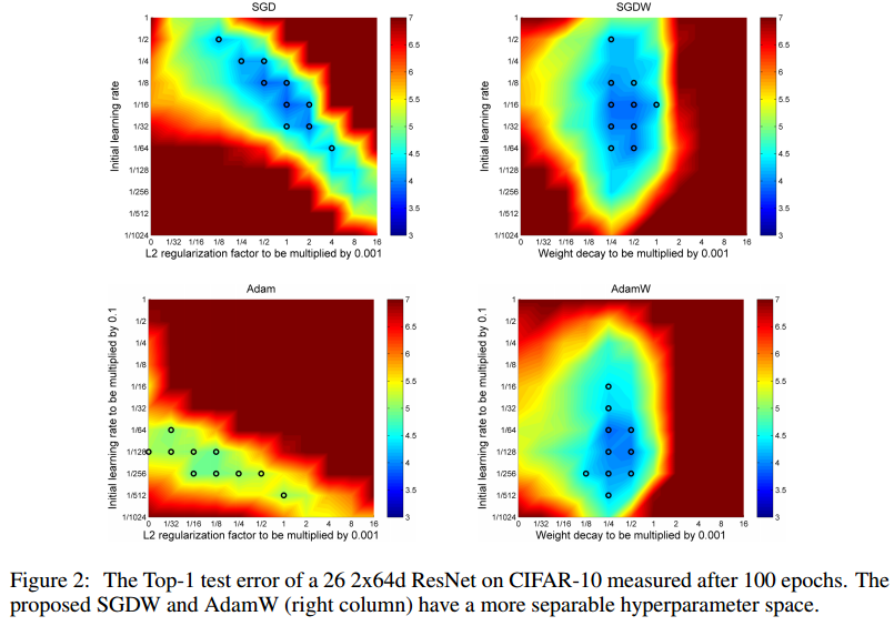 특정 task에서 Adam의 worse generalization는 (1) presence of sharp local minima, (2) inherent problems of adaptive gradient method 에 의해 발생한다고 가설을 세웁니다. 그리고 저자는 딥러닝 라이브러리에서 weight decay 방법으로 Adam의 알고리즘 내부에 구현되어 있는 L2 reguralization이 SGD보다 덜 효과적이기 때문에 poor generalization이 발생한다고 말합니다.