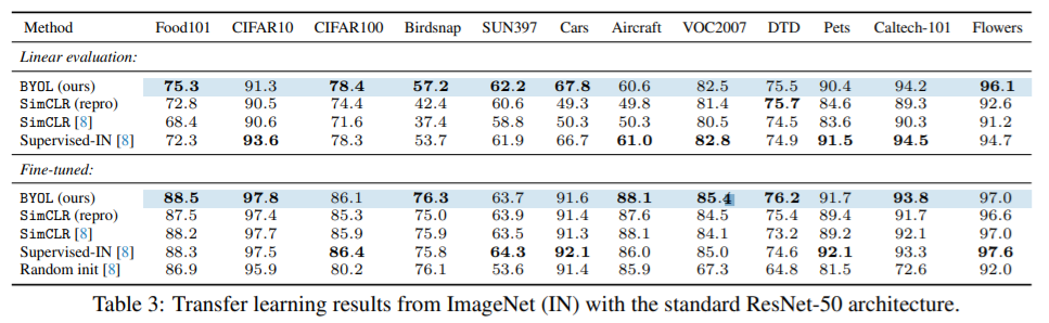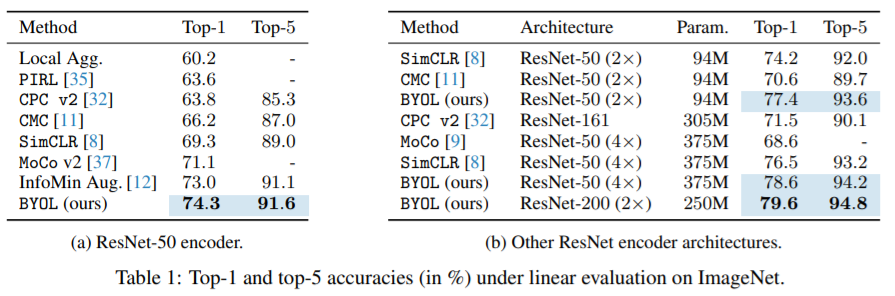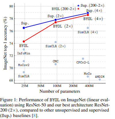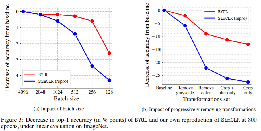 2. BYOL is more resilient to change in batch size and in image augmentation compare to its contrastive counterparts.