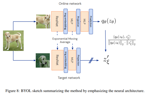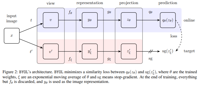 They suggest a new approch to self-supervised learning. (1) use two network referred to as online and target network and then update target network with a slow-moving average of the online network. (2) use symmetric MSE Loss that does not require negative samples