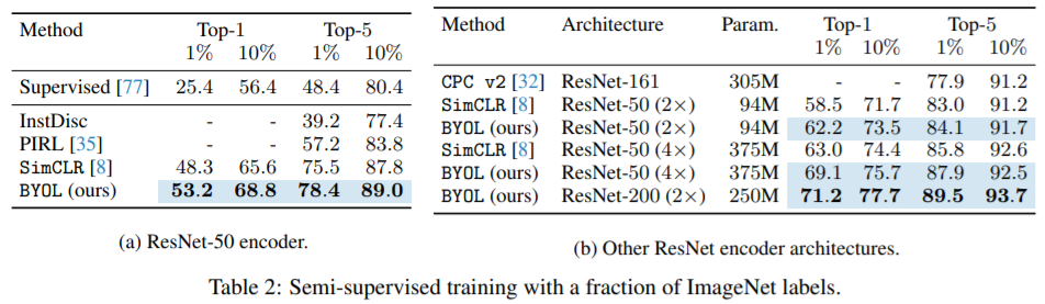 - Semi-supervised performance using 1%, 10% labels in datasets