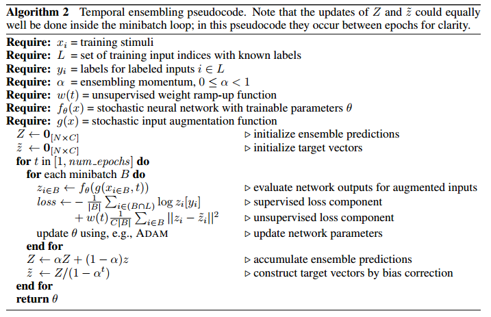 Temporal ensembling alleviates the $\sqcap$-model's problem by aggregating the predictions of multiple previous network evaluations into an ensemble prediction. It also let us evaluate the network only once during training, gaining an approximate 2x speedup over the $\sqcap$-model