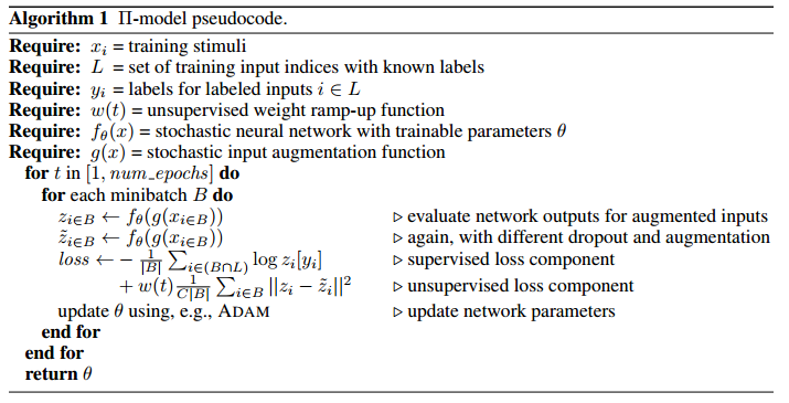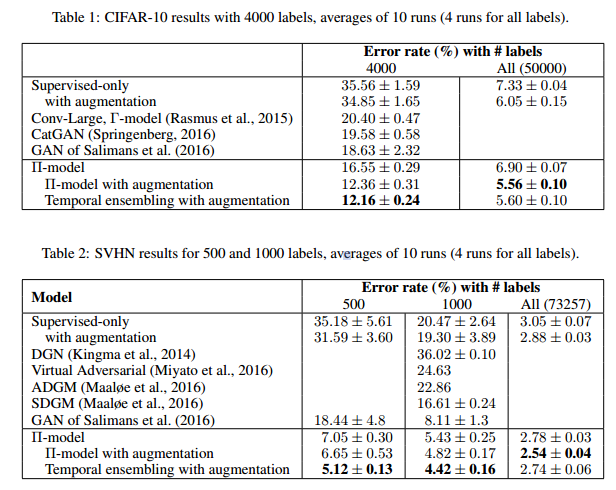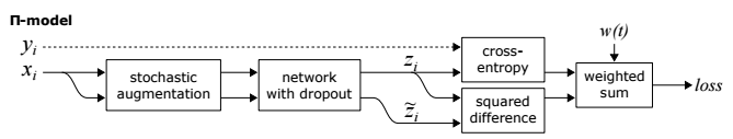 They propose $\sqcap$-model and temporal Ensemling in a semi-supervised learning setting only a small portion of training data is labeled.