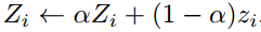 After every training epoch, the network outputs $z_i$ are accumulated into ensemble outputs $Z_i$ by updating the following formulation.
