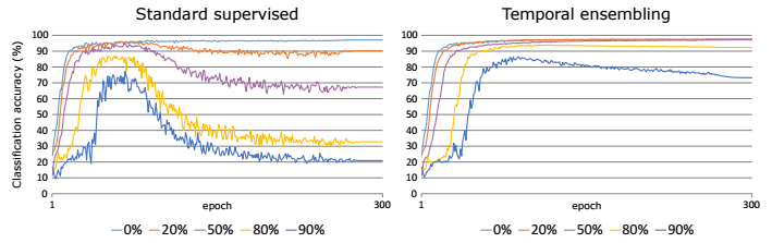 - Temporal ensembling is more tolerance to increct labels than the supervised learning. Because accumulated prediction vector make model have genelarized outputs to diffenrent classes.