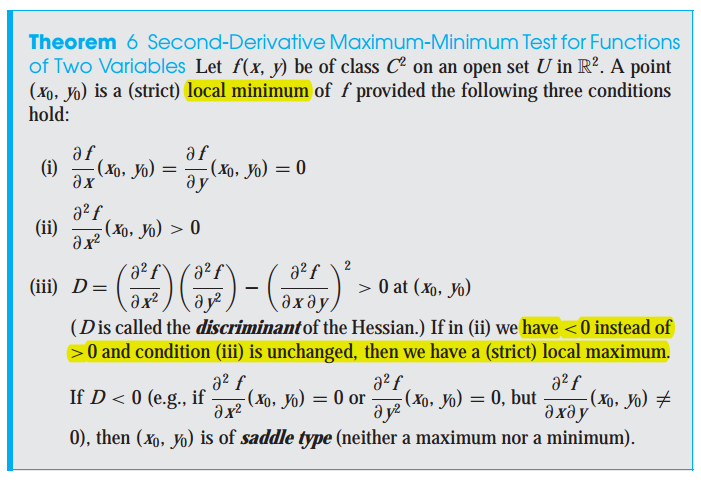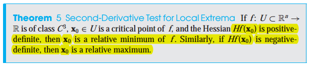 임계점(x0)에서 함수의 이차 편미분 행렬인 헤시안이 양의 정부호(positive definite)이면 x0은 극소점(relative minimum) 입니다. 비슷하게, 임계점에서 함수의 헤시안이 음의 정부호이면 x0은 극대점(relative maximum)입니다.