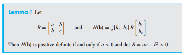 a가 0보다 크고, B의 determinant가 0 이상이면 헤시안 행렬은 양의 정부호 입니다. 만약, a가 0보다 작고 determinant가 0보다 크면 해시안 행렬은 음의 정부호 입니다.