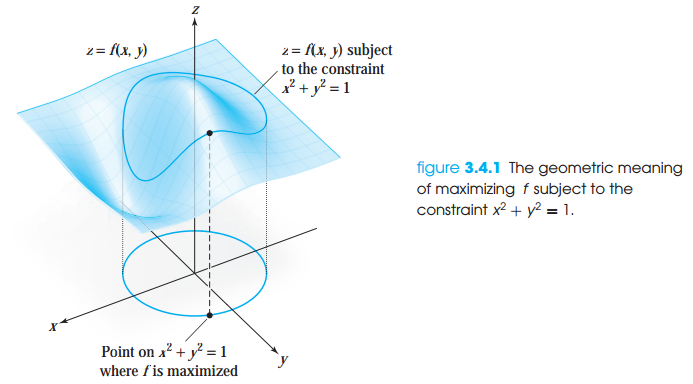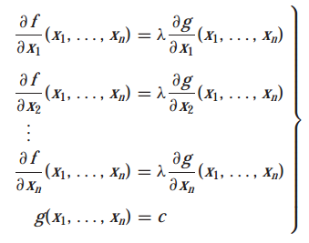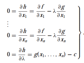 위 식은 f의 편도 함수가 g의 편도 함수와 비례한다는 것을 나타냅니다. $x_0$은 곡면 S로 제한된 f의 임계점 입니다. $x_0$을 찾는 것은 아래의 연립방정식의 해를 구하는 것입니다.