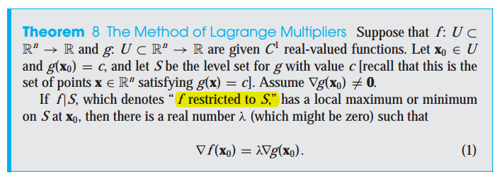 S는 x가 g(x) = c를 만족하는 R^n의 집합이라고 하겠습니다. f의 정의역을 S로 제한할 때도 f의 극소값, 극대값은 유효하여 최대, 최소값은 극값이 됩니다. 다음 정리는 제약조건에서 극값을 구하는 데 필요조건을 제공합니다.
