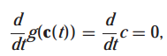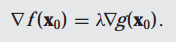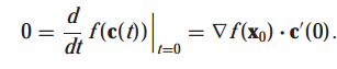 c'(0)은 $\triangledown g(x_0)$에 수직입니다. 만약 fls가 $x_0$에서 최대값을 가지면 f(c(t))는 t=0에서 최대값을 갖습니다. 따라서 chain rule에 의해 다음의 식을 얻습니다.