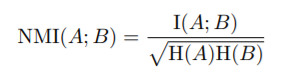 They measuer the information shared between two different assignments A and B of the same data by the Normalized Mutual Information(NMI), defined as