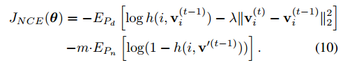 Pd is data distribution(positive), Pn is noise distribution(negative from different instance) as a uniform distribution, h is the posterior probability of sample i with feature v.