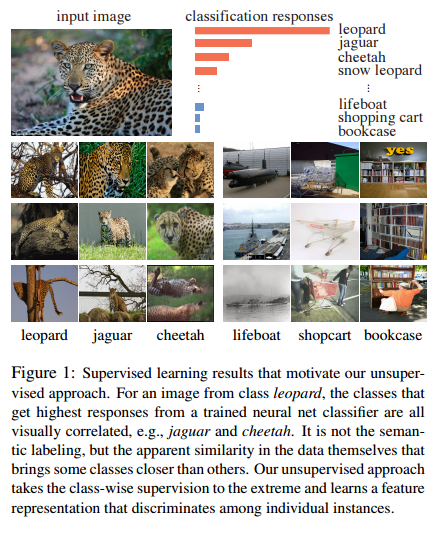The feature representations can be learned by discriminating among individual instances without any notion of semantic categories. We can find that Figure shows an image from class leopard is rated much higher by class jaguar rather than by class bookcase. This paper formulates this intuition as a non-parametric classfication problem at the instance-level by treating each image instance as a distinct class of its own.