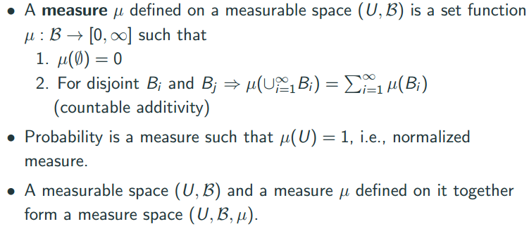 - 시그마 필드에 존재하지 않는 요소는 measure을 정의할 수 없다. 이 의미는 확률, 무게 등 정의를 못한다. 따라서 universal set U와 U의 부분 집합의 시그마 필드는 measurable space를 형성한다.