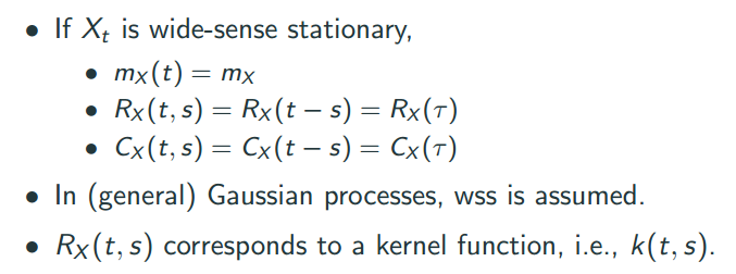 stationarity를 만족하는 random process는 shift invariance한데, 이 경우에 위와 같은 성질을 갖게 된다. auto-correlation과 auto-covariance 함수가 두 시간 차이의 함수가 된다.