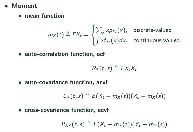 Stationarity가 나오는 이유는 랜덤 프로세스자체가 너무 많은 것이 나올 수 있기 떄문이다. 함수 공간을 다루기 때문에 함수는 정말 다양하다. 다루고자 하는 범위를 좁히기 위해 stationarty를 고려.