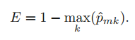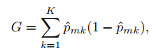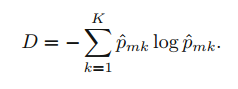 $\hat{p}_{mk}$는 m구역 내의 k class에 속하는 훈련 관측치들의 비율입니다. 하지만 이 방법은 트리를 구축하는데에 충분하지 않아 다른 두 가지 척도를 사용합니다.