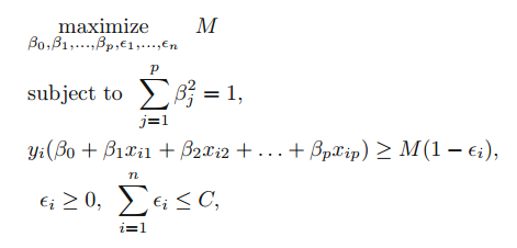 서포트 벡터 분류기는 초평면의 어느 면에 test observation이 놓이느냐에 따라 분류합니다. 초평면은 training observation을 두 개의 classes로 분류하고 몇 개의 observation은 오분류 하도록 선택합니다. 이는 아래의 최적화 문제를 푸는 것과 동일합니다.