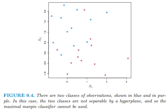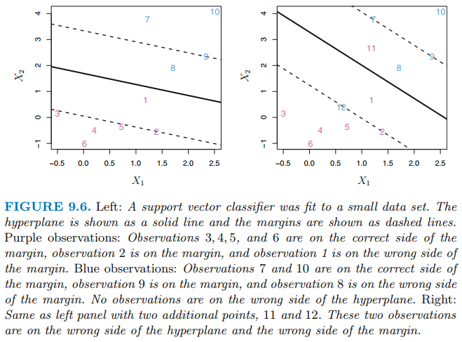 위 그림 같은 경우에 training observation은 분리 초평면(separating hyperplane)에 의해 분류되지 않습니다. 이처럼 두 class에 속하는 관측치(observation)들이 항상 초평면에 의해 분류되는 것은 아닙니다.