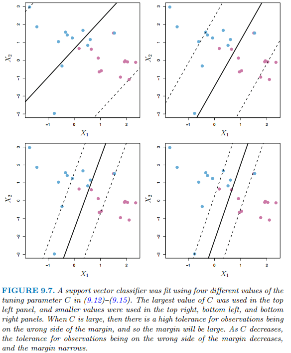 조율 파라미터 C는 $\epsilon$의 합의 경계를 결정합니다. 이는 margin을 위반하는 수와 정도를 결정합니다. C를 n개의 관측치들에 의해 위반되는 margin의 양에 대한 예산이라고 생각할 수 있습니다. C=0이면 margin을 위반하는 관측치는 존재하지 않고 이는 단순히 최대 마진 초평면 분류기의 최적화 문제가 됩니다. C > 0 인 경우 C 이하의 관측치들이 초평면의 잘못된 면에 놓여질 수 있습니다.