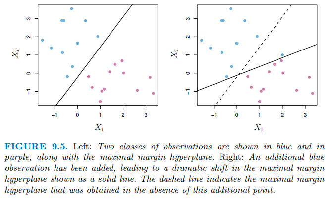 또한 관측치가 하나 추가되면 위 그림처럼 초평면이 급격하게 변화될 수 있습니다. 마진이 급격하게 감소했는데 마진은 observation에 할당된 class의 확신을 의미하므로 문제가 발생할 수 있습니다. 이처럼 분리 초평면에 기반한 분류기는 하나의 개별 관측치에 민감하게 반응할 수 있습니다. 또한 과적합을 유발할 수 있습니다.