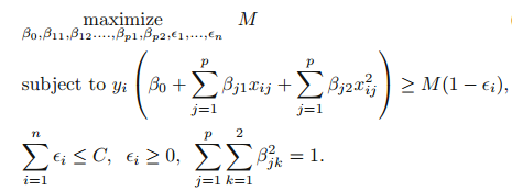 이 경우에 변수들의 고차 다항식, 3차, 2차를 사용하여 feature space를 확장함으로써 class 사이의 비선형 경계를 제공할 수 있습니다. 예를 들어 p개의 변수를 사용하여 support vector classifier를 적합하는 대신에