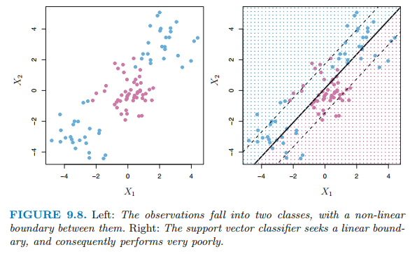 위 그림을 살펴보면 Support vector classifier가 찾은 선형 경계가 두 class 분류를 수행하지 못합니다. 이처럼 변수와 출력값 사이의 비선형 관계가 존재하는 경우에 선형 분류기는 성능이 좋지 않습니다.