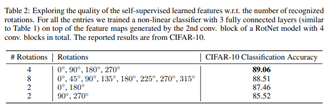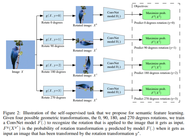 The ConvNet is trained on the 4-way image classification task of recognizing one of the four image rotation(0, 90, 180, 270). The task of predicting rotation transformations provides a powerful surrogate supervision signel for feature learning and leads to dramatic improvments on the relevant benchmarks.