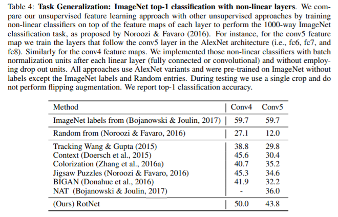 The ConvNet is trained on the 4-way image classification task of recognizing one of the four image rotation(0, 90, 180, 270). The task of predicting rotation transformations provides a powerful surrogate supervision signel for feature learning and leads to dramatic improvments on the relevant benchmarks.