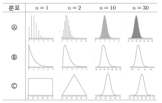 $n$이 커질수록 모집단의 형태와 관계없이 $\overling X$의 분포(표집분포)는 정규분포에 근사하게 됩니다.