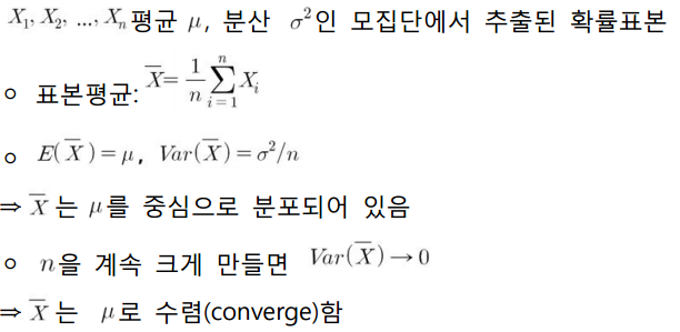 표본평균의 분산에서 n을 계속 크게 만들면 분산이 0이 됩니다. 이를 큰 수의 법칙이라고 합니다.