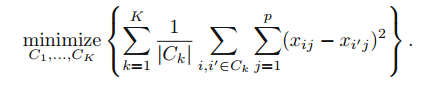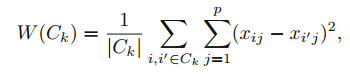 cluster 내 변동이 가능한 적어야 좋은 clustering 이라고 합니다. cluster $C_k$의 클러스너 내 변동(within-cluster variation) W($C_k$)는 cluster 내 관측치들이 서로 얼마나 다른지에 대한 정도입니다. 따라서 within-cluster variation W($C_k$)을 최소화하는 문제를 풉니다.