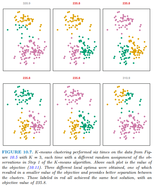 K-means algorithms은 전역 최적값(global optimum)이 아니라 국소 최적(local optimum)을 제공하므로 결과는 초기 클러스터링 할당에 의존합니다. 이러한 이유로 여러 무작위 초기값으로 알고리즘을 여러번 수행하는 것이 중요합니다. 그리고나서 가장 좋은 결과(목적 함수가 제일 낮은 값)를 선택합니다.