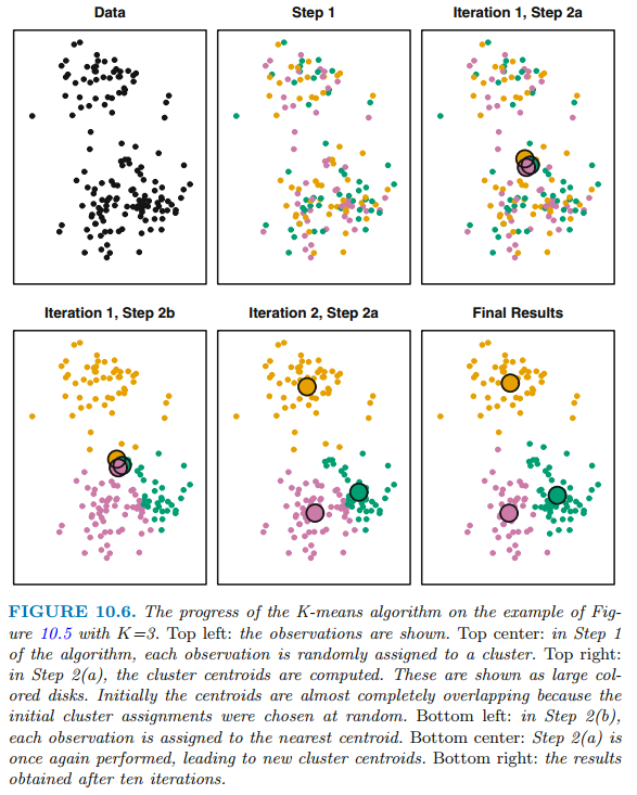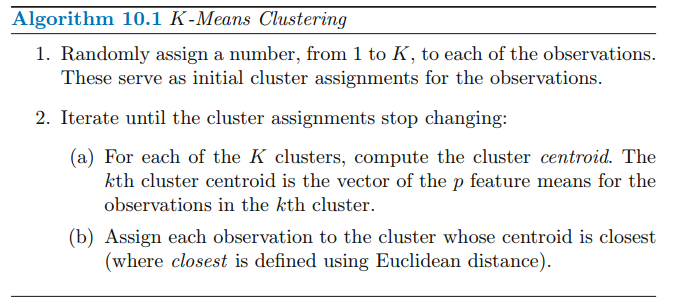 n개의 관측값들을 K개 cluster로 분할하는 방법은 $K^n$개의 방법이 존재합니다. 이를 K와 n이 큰 경우에 이를 푸는 것은 불가능 합니다. 다행히 국소 최적값(local optimum)을 제공하는 간단한 방법이 있습니다. K-means optimization 입니다.