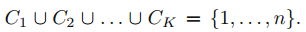 $C_1, ... C_K$를 각 cluster 내 관측치들의 인덱스들을 포함하는 집합이라고 하겠습니다. 이 집합은 두 가지 성질을 갖습니다.