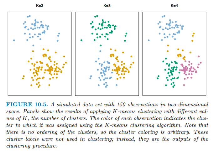 K-means clustering은 데이터 셋을 K개의 구별되고 겹치치 않는 cluster으로 분할하는 방법입니다. k-means clustering을 수행하기 위하여 cluster의 수 K를 정해야 합니다. 그리고나서 K-means algorithm은 각 관측값을 정확히 K개의 cluster 중 하나에 할당합니다. 아래 그림은 150개의 관측치로 구성된 데이터에 서로 다른 K값을 사용하여 K-means clustering을 수행한 결과입니다.