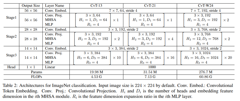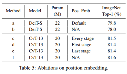 CvT의 특이사항으로는 마지막 stage에 class token을 추가하여 이 class token에 MLP head를 적용해 prediction을 합니다. 또한 positional embedding을 제거했습니다.