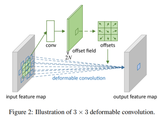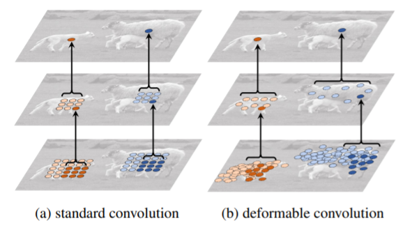 DCN을 잠깐 설명하자면 convolution filter의 kernel 위치를 학습시켜 광범위한 receptive field를 갖게 하는 것이었습니다. 기준이 되는 픽셀에 대하여 offset을 FC layer로 학습시켜 해당 offset에 대해서 conv 연산을 수행합니다. 기준 픽셀과 연관되어 있는 offset 픽셀을 학습하여 큰 객체의 경우에 큰 offset이 학습되고, 작은 객체에 대하여 작은 offset이 학습됩니다.