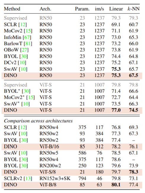 DINO는 ViT에 SSL을 적용한 논문입니다. 어떤 특징을 갖고 있는지 살펴보겠습니다. VIT 뿐만 아니라 ResNet에 DINO를 적용해도 SOTA 성능을 달성합니다.
