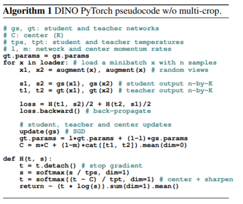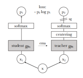 DINO에서 특이한 점은 하나의 이미지에 224x224 크기로 augmentation 적용한 이미지는 teacher, 96x96 image로 crop되어 augmentation을 적용한 이미지는 student로 전달합니다.