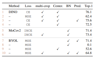 DINO는 (1) Cross-entropy loss, (2) multi-crop, (3) mean teacher, (4) centering, sharpening 네 가지 요소가 핵심 아이디어라고 생각합니다.