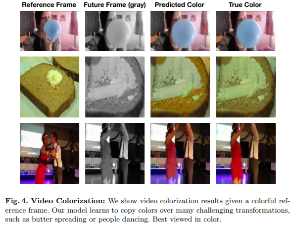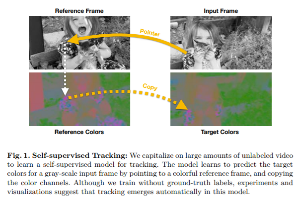 Unlabeled Video 데이터의 색상을 활용하여 colorization 모델을 학습합니다. 흑백 frame에서 직접 색상을 예측하는 대신에 reference frame와 target frame 사이의 유사도를 계산한 후, reference frame의 색상을 copy하여 유사도를 사용해 target frame의 색상을 예측합니다.