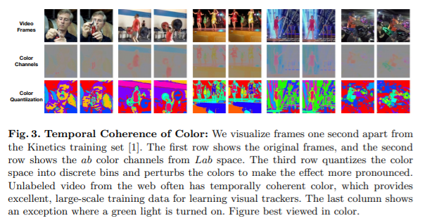 비디오에서 색상은 일반적으로 temporally stable 합니다. 갑자기 불이 켜지거나 꺼지는 상황을 제외하고 객체는 일정한 색상을 갖고 있습니다. 이 색상 정보를 활용하여 모델을 학습시킬 수 있다면 사람이 직접 labeling 하는 번거로움을 제거할 수 있습니다.