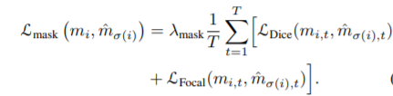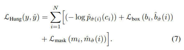 위 loss를 최소가 되도록 예측값에 gt를 할당하는 optimal assignment를 수행하고 gt가 할당된 박스와 gt 사이의 헝가리안 loss를 추가합니다. DETR과 차이점은 mask loss가 추가되었습니다.