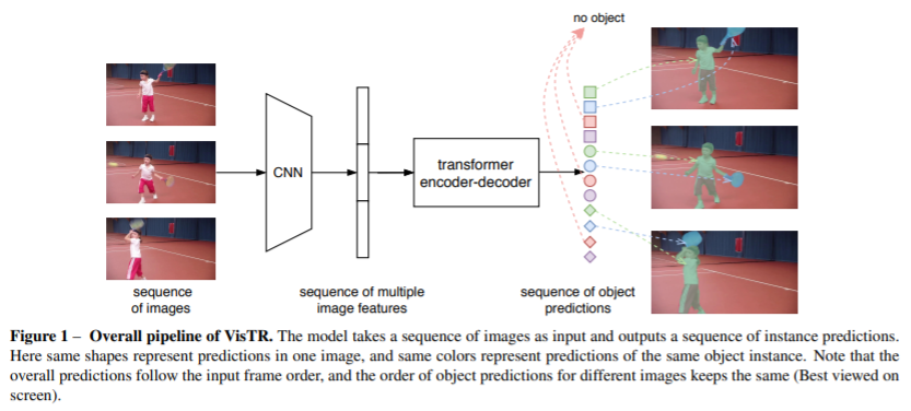 VisTR은 다수의 이미지 frame으로 구성된 video clip을 입력 받아 video 내에 존재하는 각 instance에 대한 mask의 sequence를 순서대로 출력합니다.