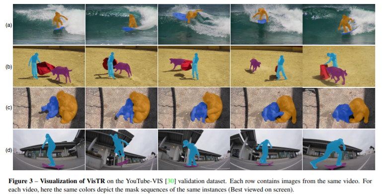 VisTR은 다수의 이미지 frame으로 구성된 video clip을 입력 받아 video 내에 존재하는 각 instance에 대한 mask의 sequence를 순서대로 출력합니다.