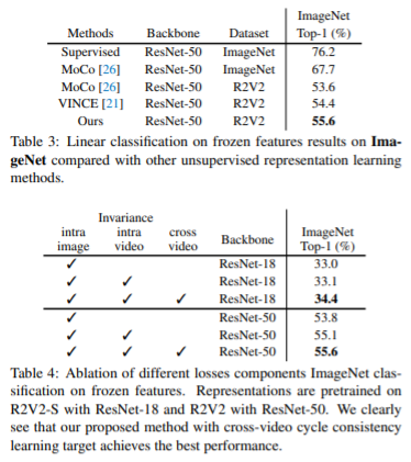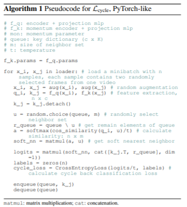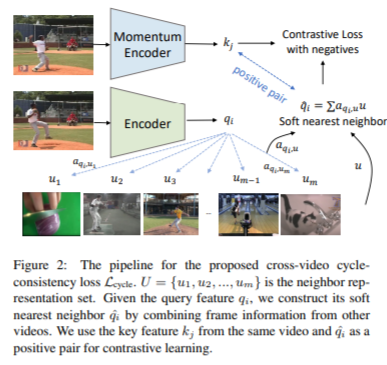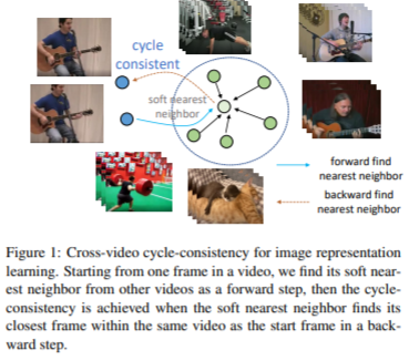 해당 논문은 서로 다른 video 내 frame이 동일한 객체를 나타낸다면 positive로 활용할 수 있도록 합니다. 이 방법을 구현하기 위하여 cycle consistency loss를 사용합니다. 즉, 기존의 동일 비디오 내 frame을 positive로 사용하는 contrastive loss와 cycle loss를 함께 사용하여 모델을 학습합니다.