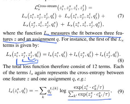 Loss도 좀 복잡한데, 하나의 encoder에 augmentation이 적용된 두 이미지를 전달합니다. 따라서 총 4개의 embedding을 생성하는데 4개를 순열로 로스를 계산합니다. 4개의 embedding은 모두 동일한 prototype에 할당되어야 하므로 다음과 같이 loss를 설계합니다. 또한 Contrastive loss를 활용합니다.