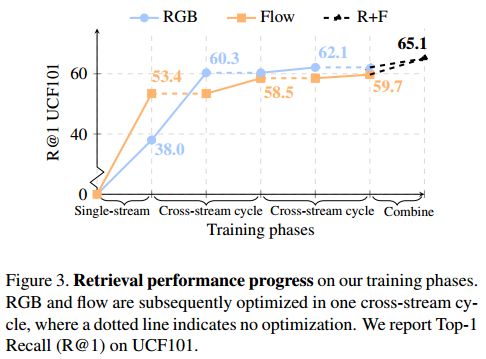 좀 특이한 점은 alternation을 사용합니다. RGB encoder는 계속 RGB 데이터를 입력받는게 아니라 optical flow도 입력 받아 학습을 진행합니다. encoder가 하나의 데이터에 overfit할 수 있는데 cross 학습을 하여 이를 방지합니다. 논문에서는 이를 transfer knowledge라고 표현합니다.